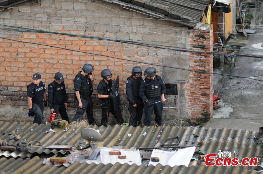 A special police team prepares to storm a room where a man has taken a woman hostage in Liuzhou city, Southwest China’s Guangxi Zhuang autonomous region, July 28, 2015. Three people, including two police officers, were injured after the five-hour standoff ended. (Photo: China News Service/Huang Weiming) |