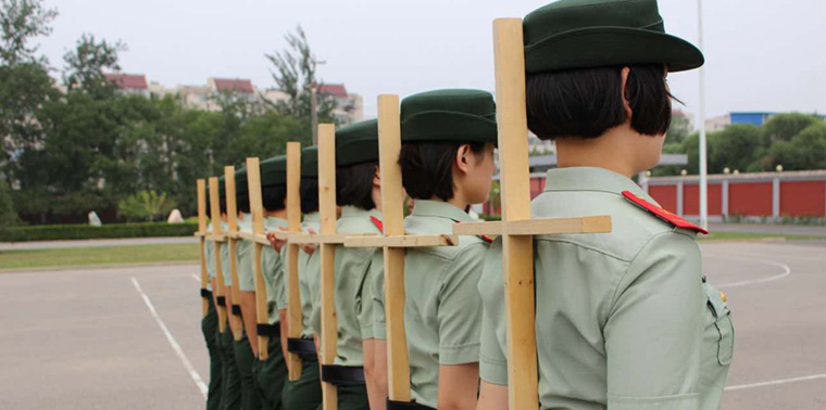 Wall of smiling faces of female PLA soldiers