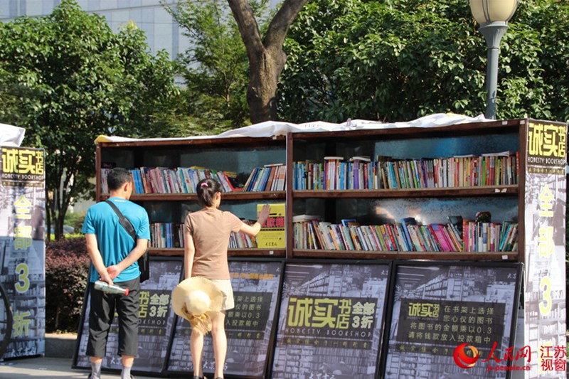 A citizen puts coins into the box to buy books. (Photo/www.jinnianhua.org)