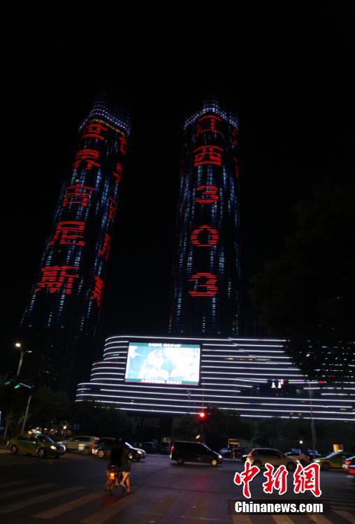 The 303-meter-high skyscraper in Nanchang, east China's Jiangxi province, sets a new Guinness record for "the world's largest LED lighting curtain" on July 28, 2015. (CNS/Wang Jian)