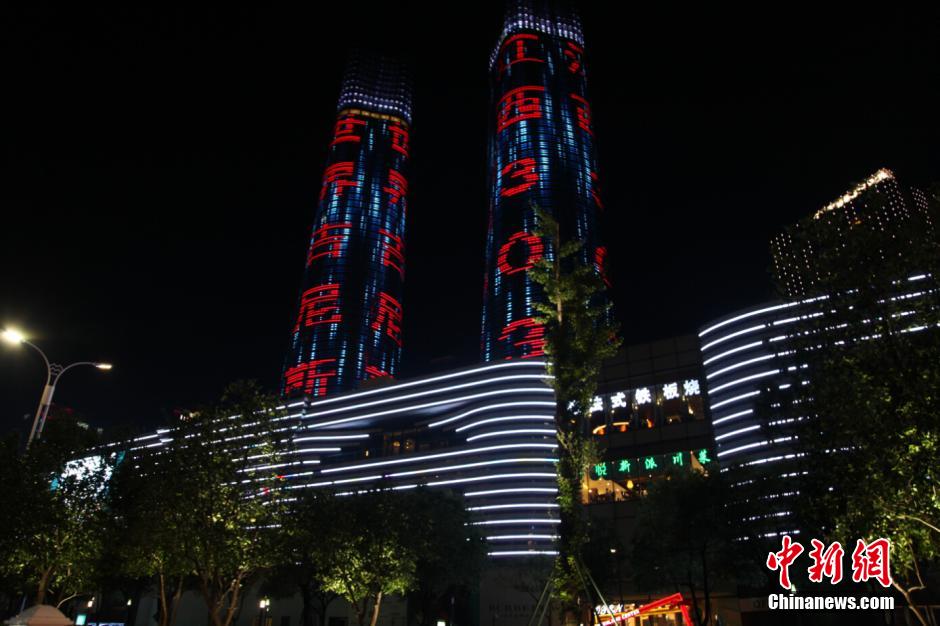 The 303-meter-high skyscraper in Nanchang, east China's Jiangxi province, sets a new Guinness record for "the world's largest LED lighting curtain" on July 28, 2015. (CNS/Wang Jian)