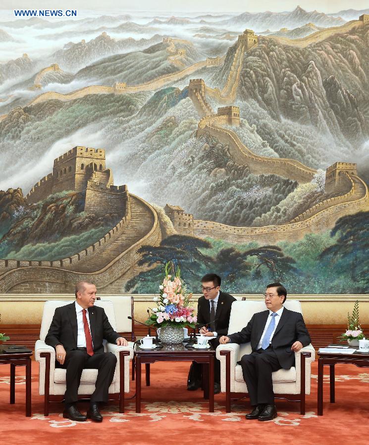 Zhang Dejiang (R), chairman of the Standing Committee of China's National People's Congress (NPC), meets with Turkish President Recep Tayyip Erdogan at the Great Hall of the People in Beijing, China, July 29, 2015. (Xinhua/Pang Xinglei)
