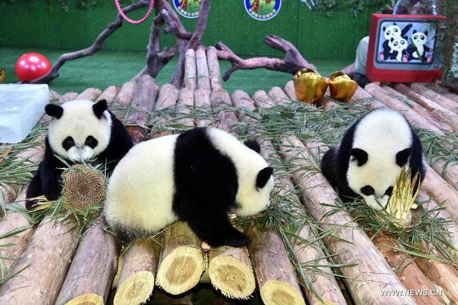 Giant panda triplets enjoy birthday party in Guangzhou