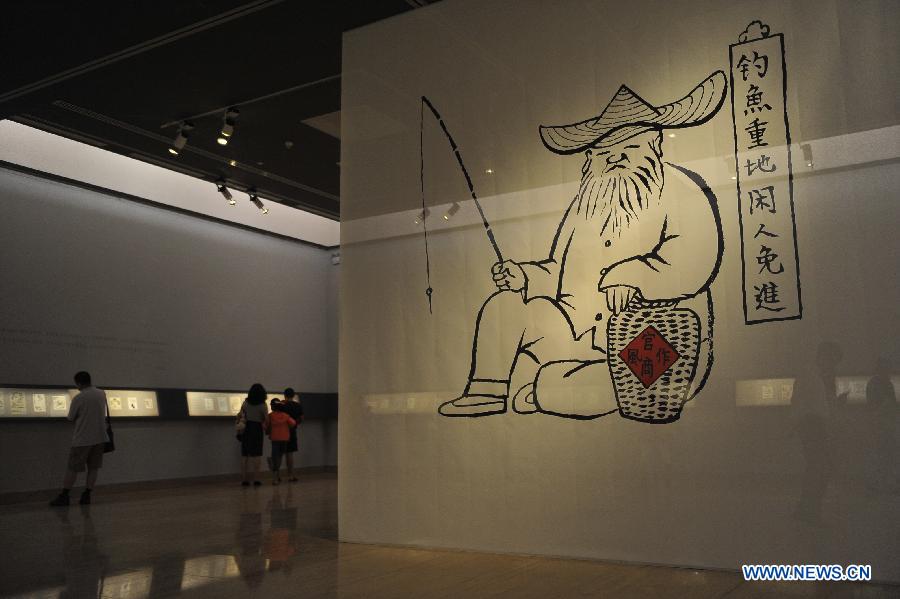 People visit an exhibition to commemorate the 100th anniversary of the birth of Chinese famous cartoonist Hua Junwu at the National Art Museum of China in Beijing, capital of China, July 30, 2015. More than 100 cartoons selected from Hua's 2,000 works were displayed at the exhibition. (Xinhua/Lu Peng) |