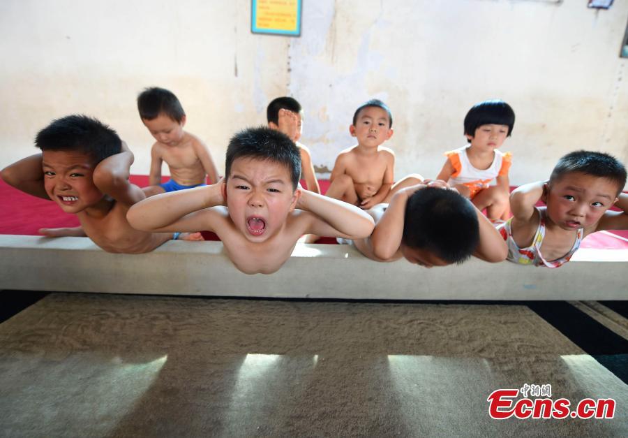 Children take part in intensive training at a gymnastics training center in Bozhou, East China's Anhui province, July 28, 2015. (Photo: China News Service/Liu Qinli)