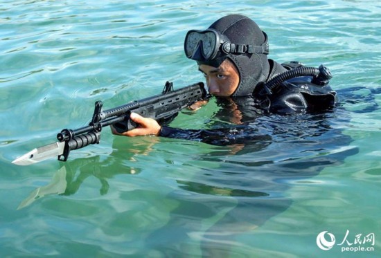 Soldiers of the special operations force of the People’s Liberation Army Navy conduct devil training in water. (Photo/81.cn)