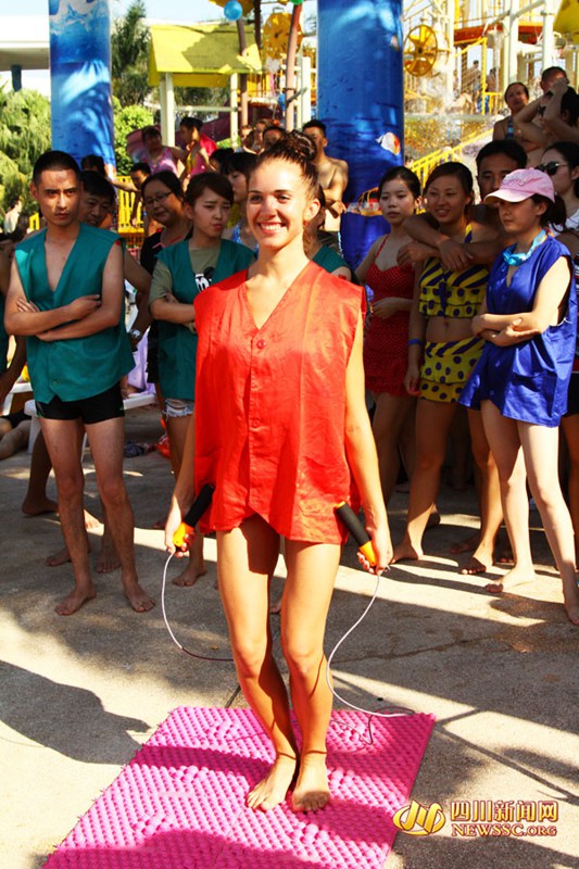 Participants from five countries including Ukraine, the Netherlands play Running Man games in Happy Valley, a large integrated amusement park In Chengdu, Sichuan province on July 25, 2015. Running Man is one of the most popular game variety shows in China. (Photo/ newssc.org) |