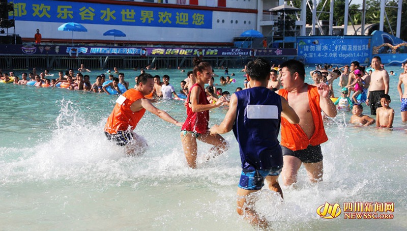 Participants from five countries including Ukraine, the Netherlands play Running Man games in Happy Valley, a large integrated amusement park In Chengdu, Sichuan province on July 25, 2015. Running Man is one of the most popular game variety shows in China. (Photo/ newssc.org) |