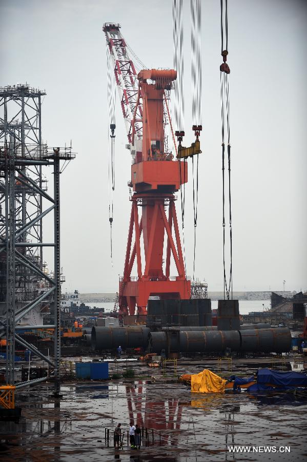 Workers assemble the drilling rig HYSY 982 at China Oilfield Services Limited in Dalian, northeast China's Liaoning Province, July 31, 2015. HYSY 982 is a sixth generation deep-water semi-submersible drilling rig equipped with DP 3 dynamic positioning system, designed for a maximum operating depth of 5,000 feet (1,524 meters) and a maximum drilling depth of 30,000 feet (9,144 meters). It is expected to be delivered in August 2016. (Xinhua/Yang Qing)
