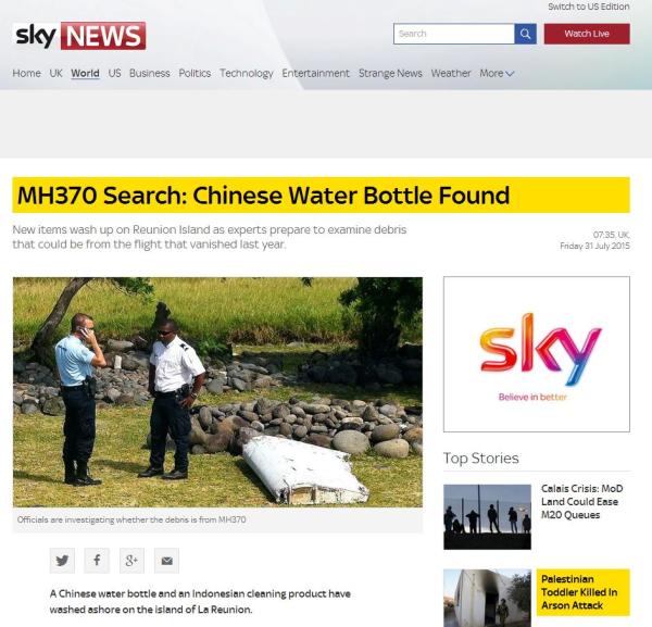 A Chinese water bottle and an Indonesian cleaning product have been found on Reunion Island, where debris that could be from MH370 was found this week, according to Sky News.