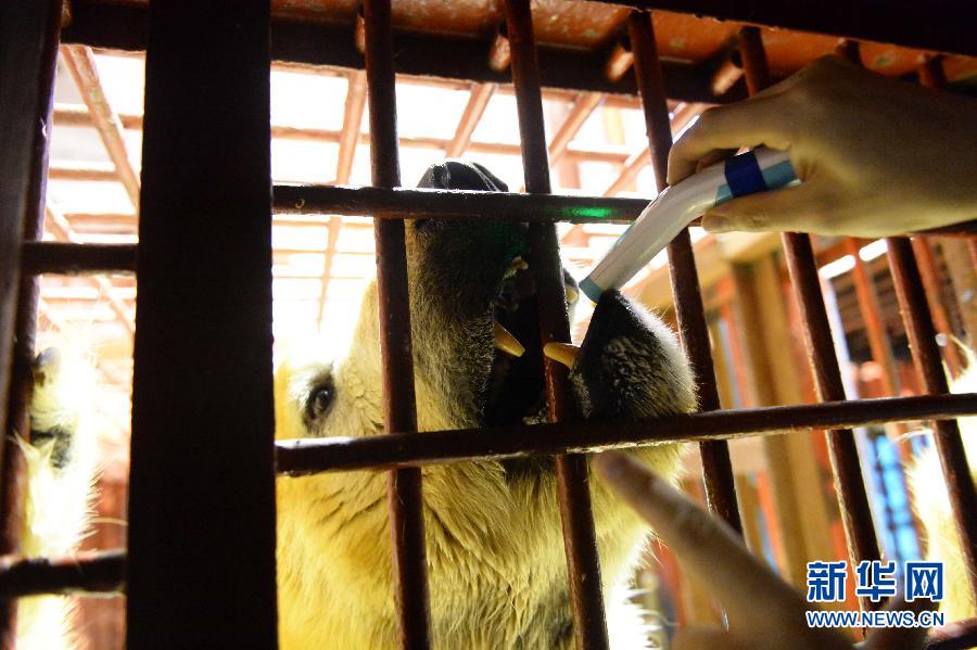 Tamer Dong takes polar bear's temperature, July 30, 2015. (Xinhua/Wang Kai)