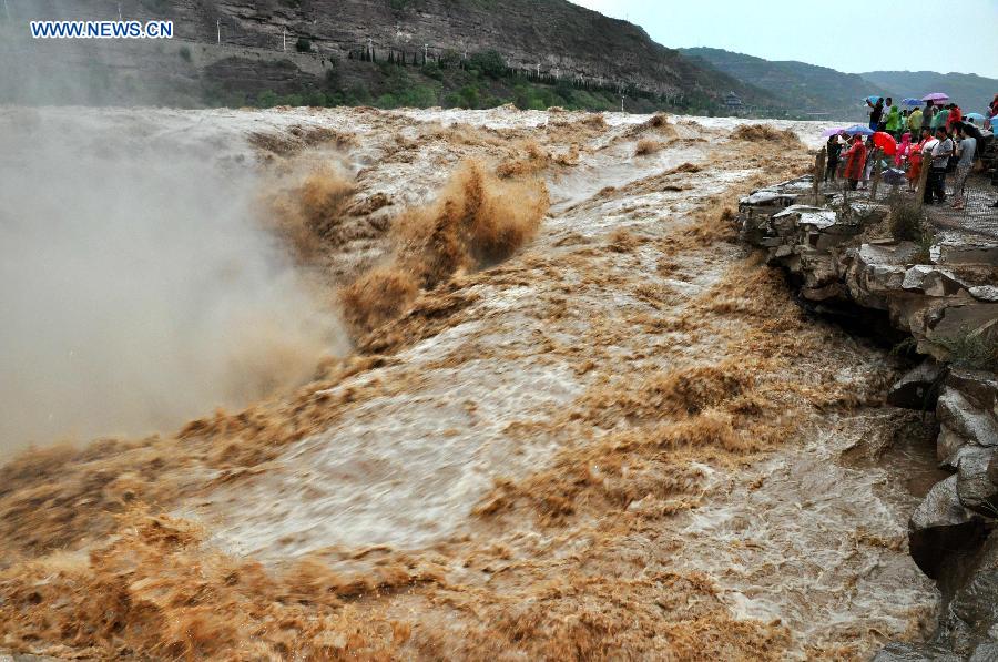 Tourists visit the Hukou Waterfall of the Yellow River in Jixian County, north China's Shanxi Province, Aug. 2, 2015. (Xinhua/Lyv Guiming)