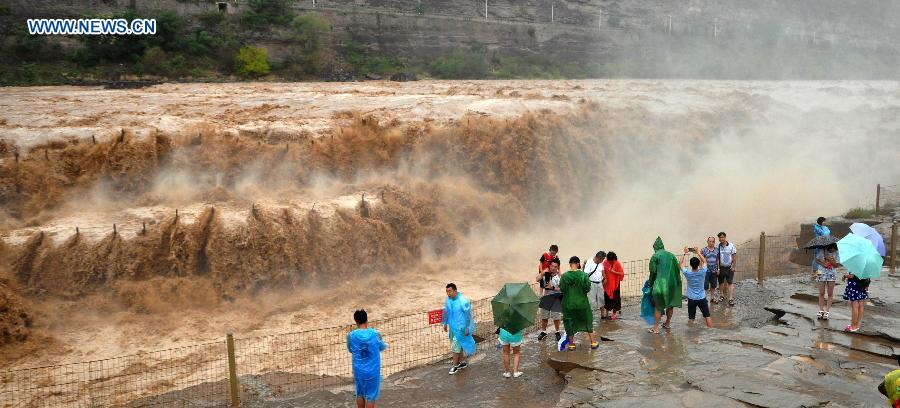 Tourists visit the Hukou Waterfall of the Yellow River in Jixian County, north China's Shanxi Province, Aug. 2, 2015. (Xinhua/Lyv Guiming)