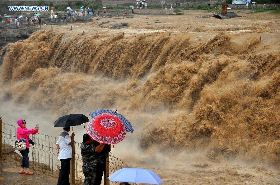 Tourists visit the Hukou Waterfall of the Yellow River in Jixian County, north China's Shanxi Province, Aug. 2, 2015. (Xinhua/Lyv Guiming)