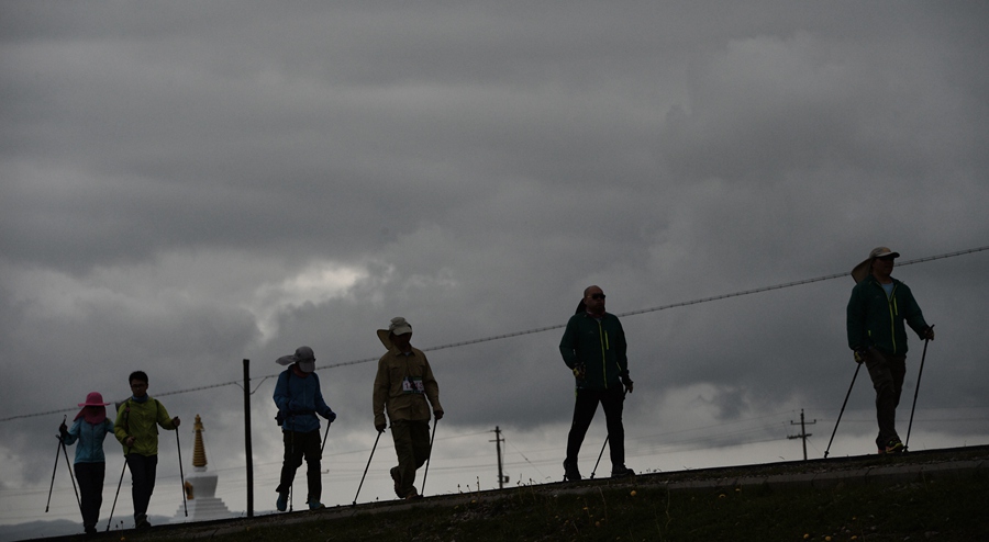 Participants walk along the Qinghai Lake on Aug. 2, 2015. (Photo/ Xinhua)