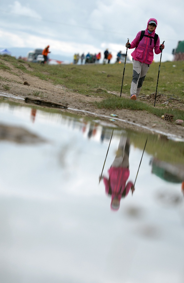 A participant walks along the Qinghai Lake on Aug. 2, 2015. (Photo/ Xinhua)