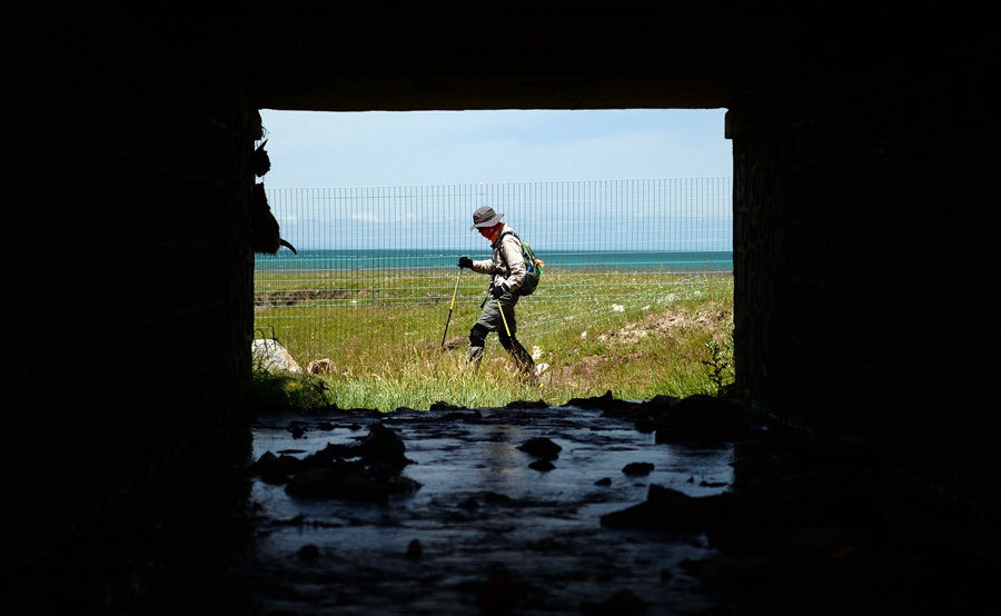 A participant walks along the Qinghai Lake on Aug. 2, 2015. (Photo/ Xinhua)