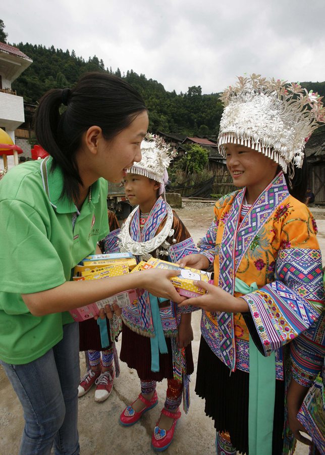 Student from Anyang Normal University, central China's Henan Province, volunteers to come to Liudoumiao village of South China's Guangxi Zhuang Autonomous Region to give local pupils classes and accompany them in the summer vacation. (Photo/ Xinhua) |