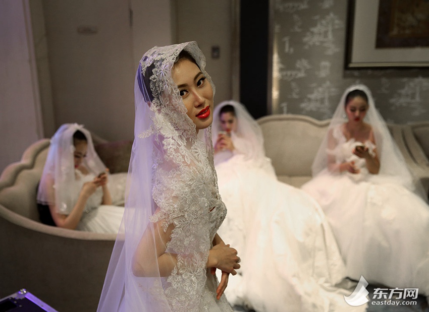Sixteen Chinese contestants for 2015 Miss Universe 2015 pageant present bridal dresses for a high-end custom wedding show held in Shanghai Shangri-La Hotel on Aug. 3, 2015. (Photo/ eastday.com)