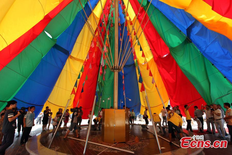 An umbrella of 23 meters in diameter and 18 meters in height is certificated as the world's largest umbrella by Guinness World Records in Xingzi county, East China’s Jiangxi province, Aug 3, 2015. The umbrella weighs 5.7 tonnes and can cover an area of 418 square meters. A company invested 700,000 yuan($113,000) to build the umbrella in half a year. (Photo: China News Service/Wei Dongsheng)