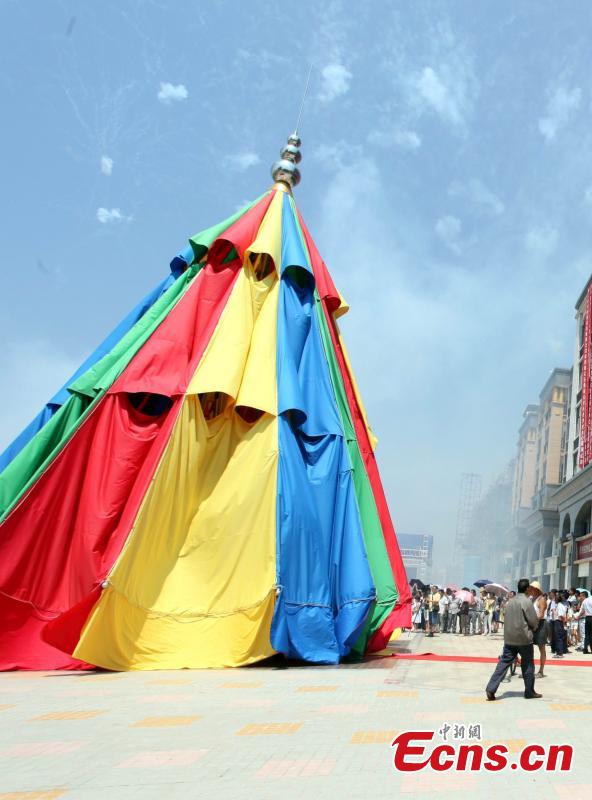 An umbrella of 23 meters in diameter and 18 meters in height is certificated as the world's largest umbrella by Guinness World Records in Xingzi county, East China’s Jiangxi province, Aug 3, 2015. The umbrella weighs 5.7 tonnes and can cover an area of 418 square meters. A company invested 700,000 yuan($113,000) to build the umbrella in half a year. (Photo: China News Service/Wei Dongsheng) |