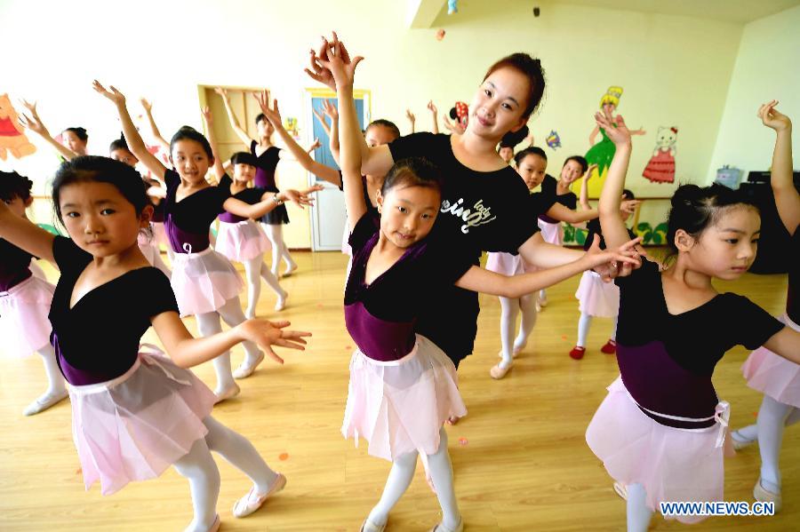 A teacher guides a child in a dance class in Hongning Dancing School in Bozhou, east China's Anhui Province, Aug. 4, 2015. Many children here chose to take dancing class to spend their summer vacation. (Xinhua/Liu Qinli)
