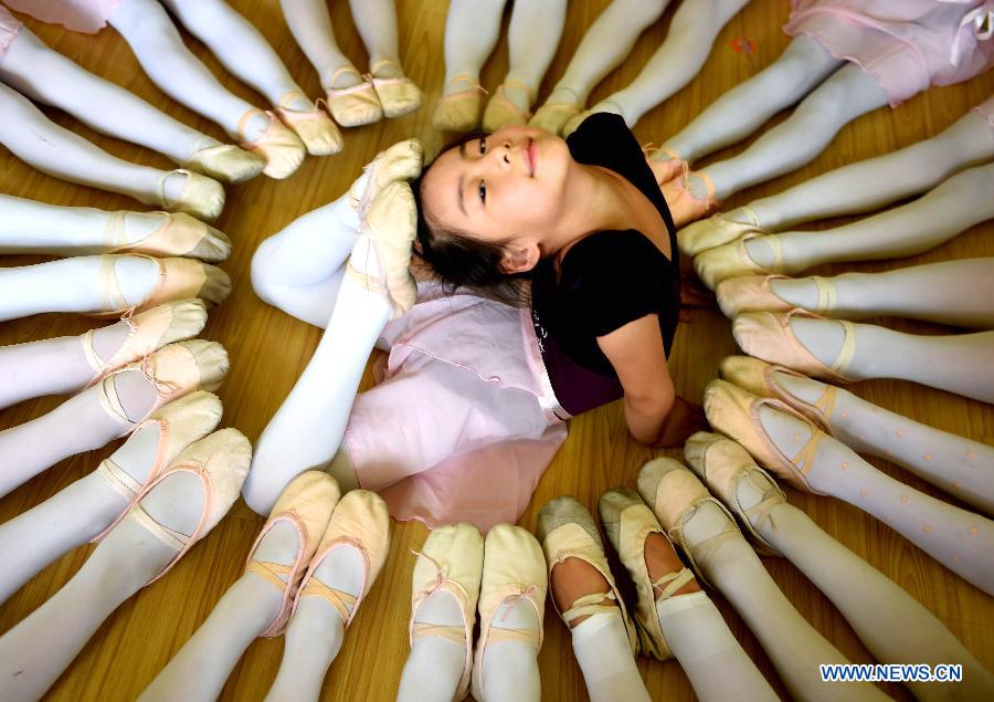 Children practice basic skills in a dance class in Hongning Dancing School in Bozhou, east China's Anhui Province, Aug. 4, 2015. Many children here chose to take dancing class to spend their summer vacation. (Xinhua/Liu Qinli)