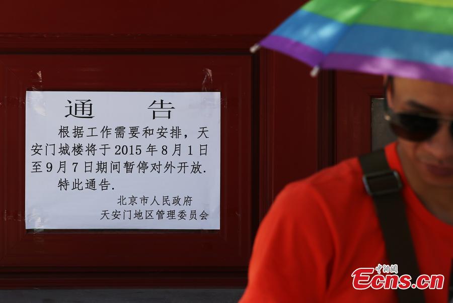 The Tiananmen Rostrum is temporarily closed to visitors and tourism services are suspended between August 1, and September 7 in Beijing for the upcoming military parade, which will be held this September to commemorate the 70th anniversary of victory in the Chinese People's War of Resistance against Japanese Aggression. (Photo: China News Service/ Liu Guanguan)