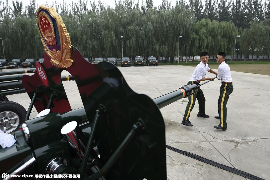 Dozens of guns appear in a drill field in Beijing on Aug. 1, 2015. An armed police force unit responsible for providing gun salutes is in active preparation for the upcoming military parade of the 70th Anniversary of the Victory of the Chinese People’s War of Resistance Against Japanese Aggression and the World Anti-fascist War. (Photo/CFP) |