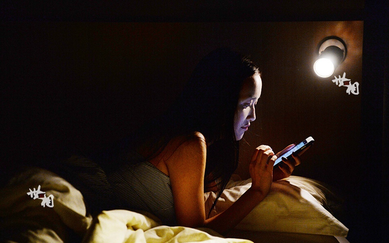 Ye Xin chats with another showgirl through wechat app on smart phone at night. (China. com.cn/ Lai Xinlin)