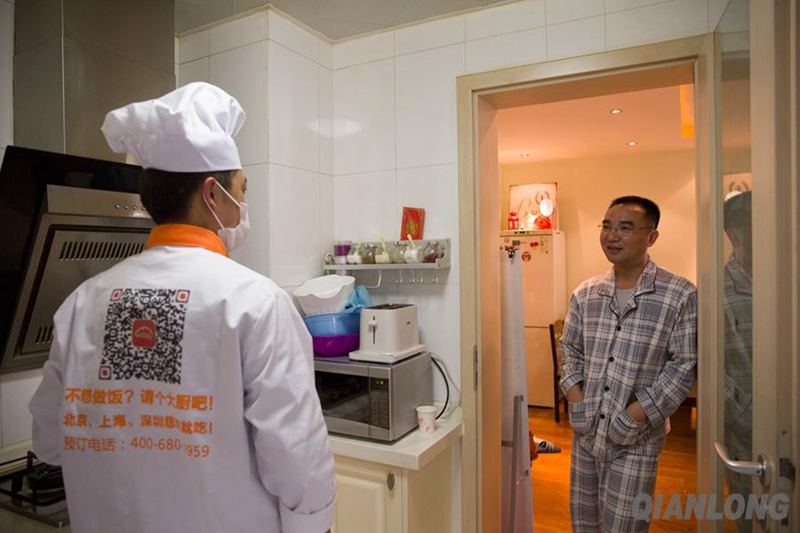 Client (R) thanks Zhao for cooking for his family. (Qianlong/ Yu Ying)