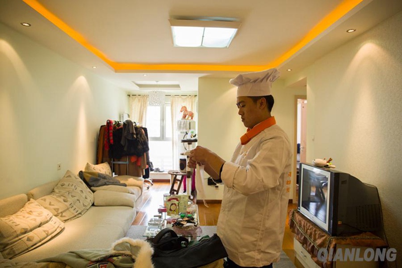 He puts on uniform upon arriving at the client’s home. (Qianlong/ Yu Ying)