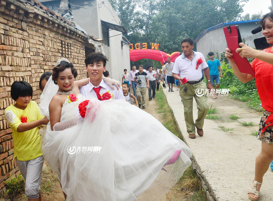 Cycling enthusiast Liu Zhaohui, accompanied by over 60 friends from his cycling club, rides 26 km to fetch his bride Zhang Ningning in Liaocheng, east China’s Shandong province on Aug. 3, 2015. The couple got acquainted in the cycling club, and they chose to have a “low carbon wedding” through riding. (Photo/iqilu.com) |