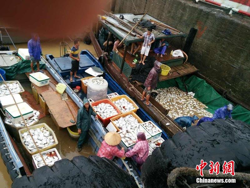 3,426 tons of gold pomfrets die in a heavy storm which lasted for several days in Qinzhou, southwest China's Guangxi, which has causes a direct economic loss of 75 million yuan. Currently, the dead fishes have basically been salvaged, and the disaster relief work by local government is underway. (CNS/Li Qiteng)
