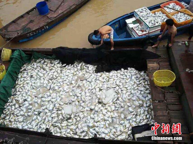 3,426 tons of gold pomfrets die in a heavy storm which lasted for several days in Qinzhou, southwest China's Guangxi, which has causes a direct economic loss of 75 million yuan. Currently, the dead fishes have basically been salvaged, and the disaster relief work by local government is underway. (CNS/Li Qiteng)