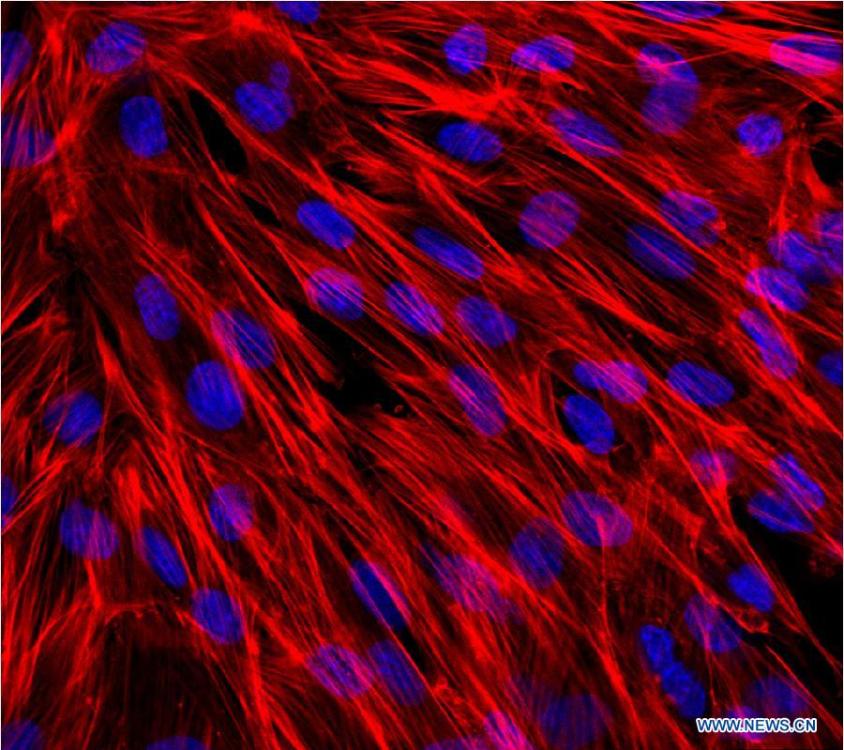Photo provided by Xinqiao Hospital of Third Military Medical University in southwest China's Chongqing on Aug. 5, 2015 shows a cytoskeleton magnified 1,600 times viewed under a microscope. The university took a series of photos of organs and tissues of human body in microscopic level by using techniques like nuclear magnetic resonance (NMR), color ultrasonography and confocal laser scanning microscopy. Such techniques and photos will provide an insight for observing life process and guide accurate surgeries for medical staff. (Photo/Xinhua) |