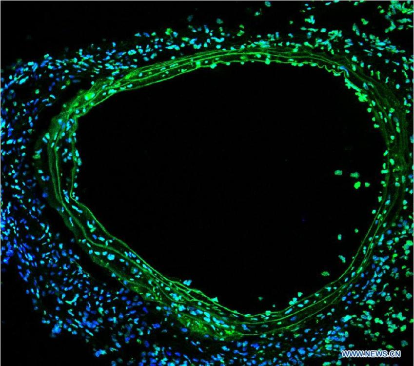 Photo provided by Xinqiao Hospital of Third Military Medical University in southwest China's Chongqing on Aug. 5, 2015 shows a vascular transection magnified 400 times viewed under a microscope. The university took a series of photos of organs and tissues of human body in microscopic level by using techniques like nuclear magnetic resonance (NMR), color ultrasonography and confocal laser scanning microscopy. Such techniques and photos will provide an insight for observing life process and guide accurate surgeries for medical staff. (Photo/Xinhua) |