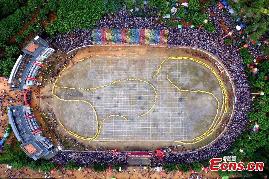 People from the Yi ethnic group sing and dance to celebrate the Torch Festival in Puge county, Southwest China’s Sichuan province, Aug 5, 2015. The festival, which usually falls on June 24 in the lunar calendar, is the biggest festival of the Yi people. During the festival, they will hold wrestling and bullfighting events in the village. The focus of the torch festival is at night. People either light torches to pray for a good harvest or light bonfires and host parties with singing and dancing. The Torch Festival in Puge county is known for being mysterious and primitive, attracting nearly 100,000 residents to the celebration this year. (Photo: China News Service/Liu Zhongjun)