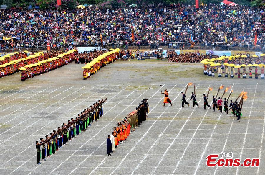 People from the Yi ethnic group sing and dance to celebrate the Torch Festival in Puge county, Southwest China’s Sichuan province, Aug 5, 2015. The festival, which usually falls on June 24 in the lunar calendar, is the biggest festival of the Yi people. During the festival, they will hold wrestling and bullfighting events in the village. The focus of the torch festival is at night. People either light torches to pray for a good harvest or light bonfires and host parties with singing and dancing. The Torch Festival in Puge county is known for being mysterious and primitive, attracting nearly 100,000 residents to the celebration this year. (Photo: China News Service/Liu Zhongjun)