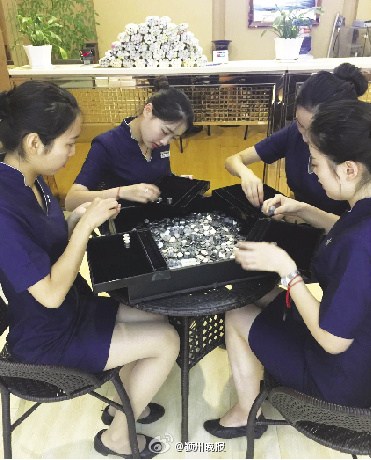 Jewelry store staff in Anhui province calculate coins afforded by a young man in Fuyang city. (Photo/Chinanews.com)
