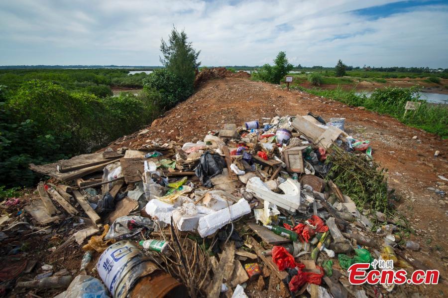 Garbage litters the road of a real estate project near a protected mangrove wetland in Chengmai county, South China’s Hainan province, Aug 5, 2015.