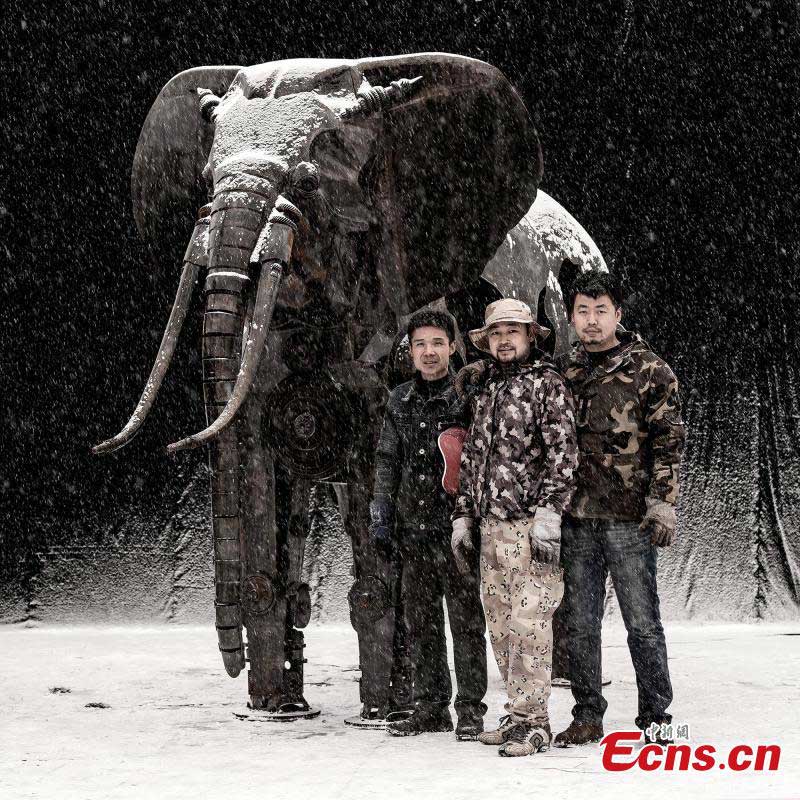 The three designers quit their jobs in Guangdong province, Beijing, and Hunan province to jointly launch their start-up in the county, focusing on works that integrate recycled materials with Xinjiang’s local culture. All fans of Transformers, they have created works that move, blink eyes or wag tails. The designers say they want their work to promote innovation and environmental protection. (Photo provided to China News Service)