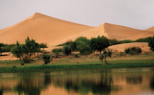 The oasis in Kubuqi desert in Xinjiang. (Photo/gmw.cn) |