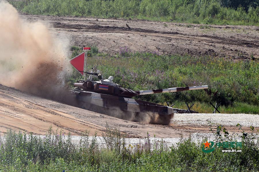 The individual race of the "Tank biathlon" contest kicked off on Aug. 3 at the Alabino training range in Moscow Region, which was held in the course of the Russian International Army Games 2015. The type 96A tanks of the Chinese People's Liberation Army team participated in the race. (Photo/www.81.cn) |