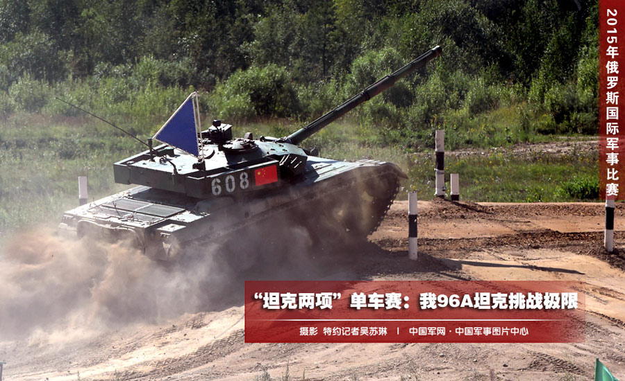 The individual race of the "Tank biathlon" contest kicked off on Aug. 3 at the Alabino training range in Moscow Region, which was held in the course of the Russian International Army Games 2015. The type 96A tanks of the Chinese People's Liberation Army team participated in the race. (Photo/www.81.cn)