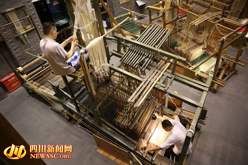 Inheritors of Sichuan brocade handcraft show visitors the whole process of making the brocade on the traditional weaving machine in Sichuan Brocade Museum on Aug. 3, 2015. One of the weaving machines they use is passed down from Qing Dynasty (1636-1912). (Photo/NEWSSC.ORG)