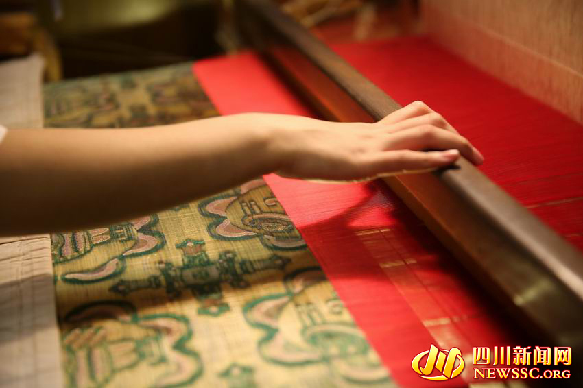 Inheritors of Sichuan brocade handcraft show visitors the whole process of making the brocade on the traditional weaving machine in Sichuan Brocade Museum on Aug. 3, 2015. One of the weaving machines they use is passed down from Qing Dynasty (1636-1912). (Photo/NEWSSC.ORG)