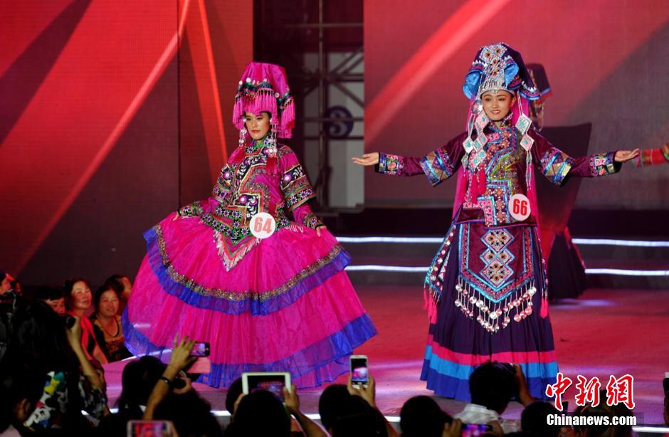 Models show beautiful costumes of the Yi nationality on T stage. (Photo by China News Agency/ Liu Zhongjun)