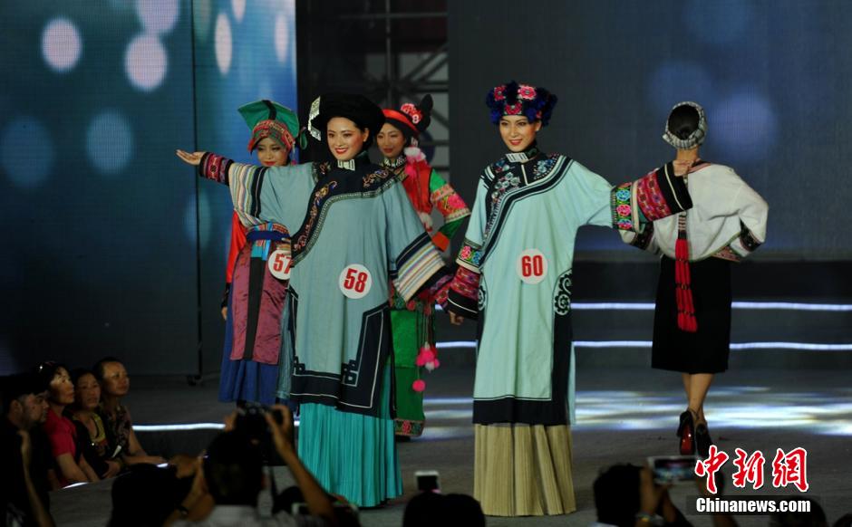 Models show beautiful costumes of the Yi nationality on T stage. (Photo by China News Agency/ Liu Zhongjun)