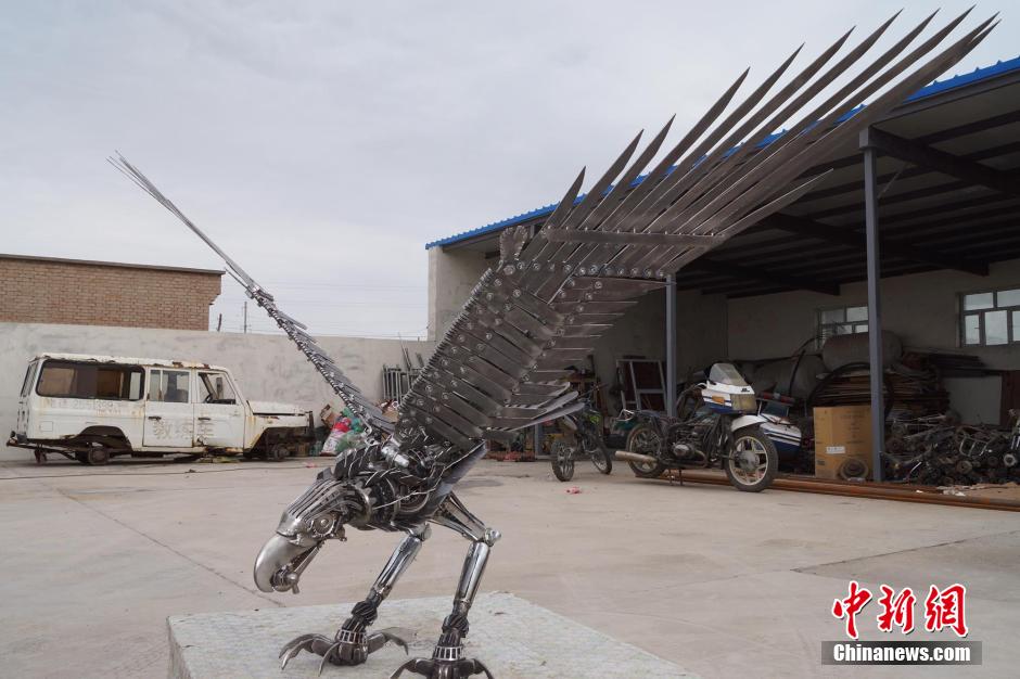 Three brothers in Xinjiang start a business after they quit their jobs. They advocate environment protection and create artworks made of discarded car parts and building materials. (CNS/Jingyi sculpture studio)